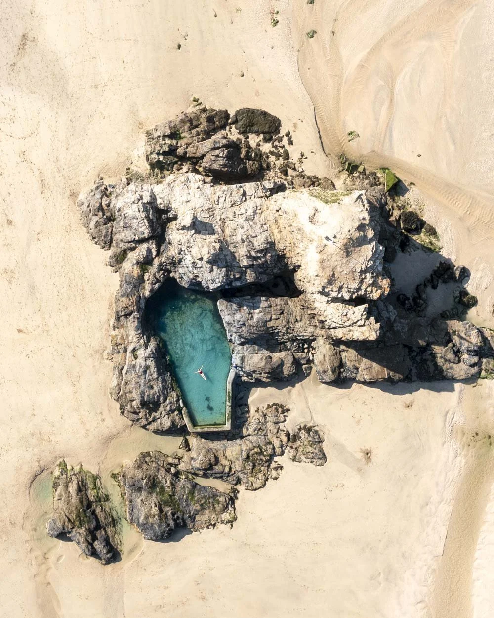 Chapel Rock Pool is one of Cornwall’s quirkier tidal pools, hiding inside a little rocky outcrop in the middle of Perranporth Beach. At low tide it’s set so far back from the sea that from above it looks like it’s completely marooned.