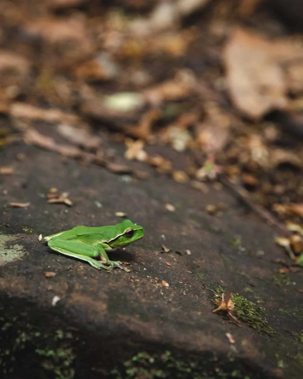 After roughly 400m walking along the flat path, you’ll start descending down to the creek on a series of rocky steps. We saw a cute little green frog here which seemed to be a bit out of place so high above the water!