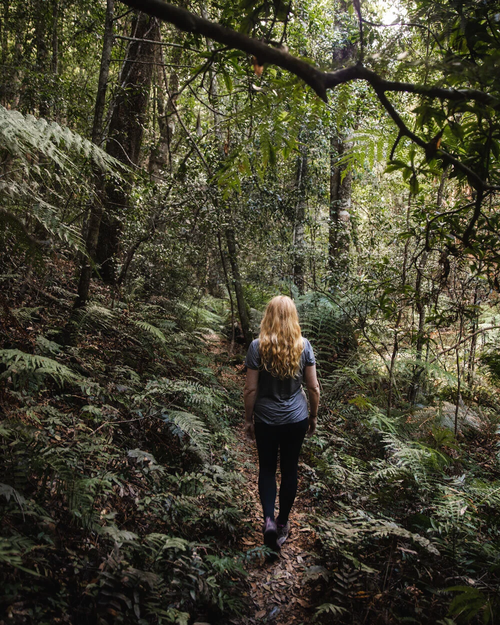 When you’re almost at the 2.5km mark, you’ll begin heading uphill for a while and the rainforest starts to give way to drier bushland.