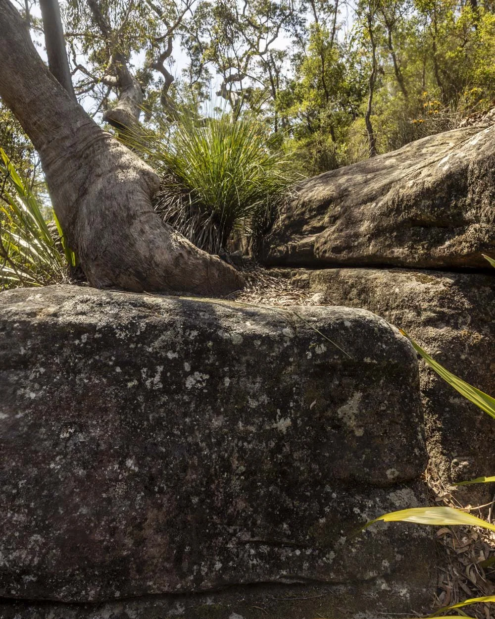 You’ll reach the end of the obvious trail after 180m at which point you will be standing on some large rocks. There’s a unique looking tree that marks the spot to look for.