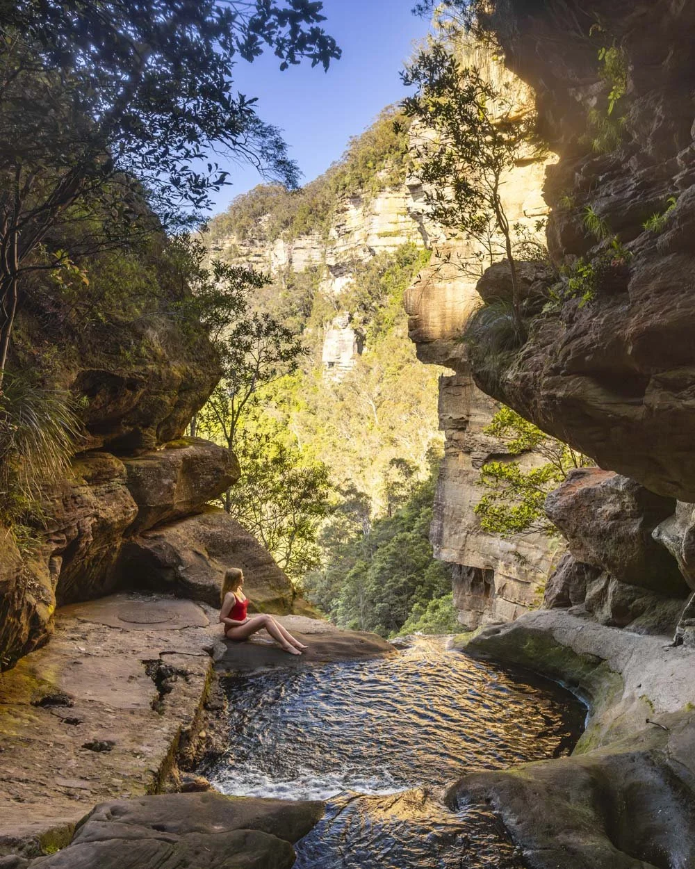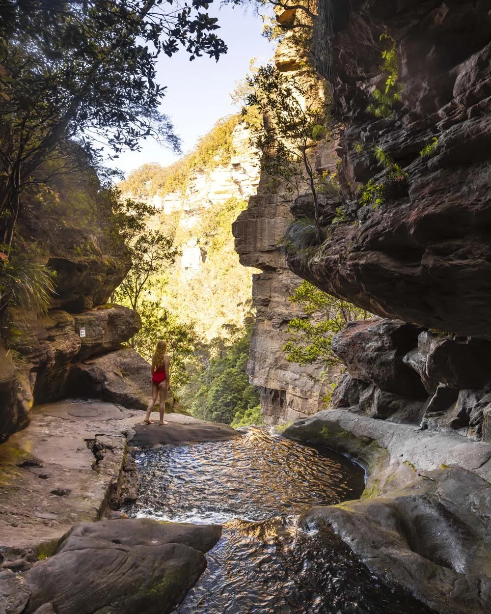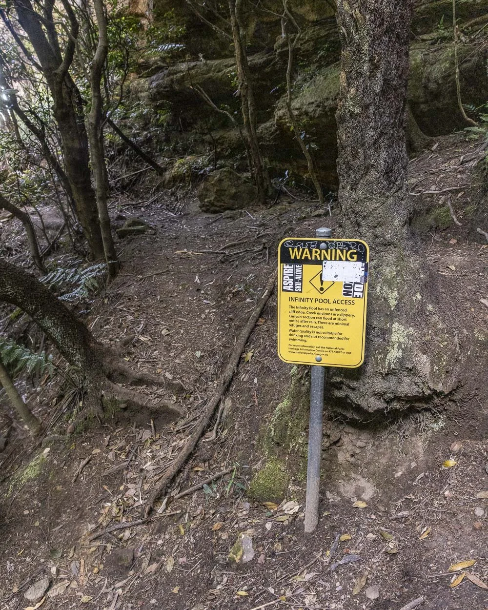 The National Parks and Wildlife Services NSW would prefer that you do not visit the infinity pool as it is off track and an unfenced cliff edge. The trail that it is located on has been closed frequently in recent times, so make sure you check the Parks Alerts for the Amphitheatre Track if you still choose to visit.